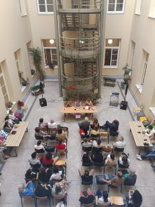 Η αίθουσα στο ισόγειο γέμισε. Οι παρευρισκόμενοι ήταν φοιτητές και άνθρωποι που είχαν περιέργεια ν’ ακούσουν για τις φυλακές και τις απάνθρωπες συνθήκες κράτησης εκεί. Έγινε μια κουβέντα για τη σημασία των εικαστικών, του θεάτρου και της καλλιτεχνικής επεξεργασίας του τραύματος σε συνθήκες στέρησης ελευθερίας. Είδαμε έργα των κρατουμένων. Μερικά ήταν πολύ καλά. Σημείωσα στο σημειωματάριο μου: «μία από τις σπάνιες περιπτώσεις που οι φοιτητές Νομικής μπορούν να σκεφτούν το ποινικό δίκαιο έξω από τη σκοπιά της ποινικής δικονομίας ή του δόγματος». Μια διαδικασία διόρθωσης της ευαισθησίας τους.