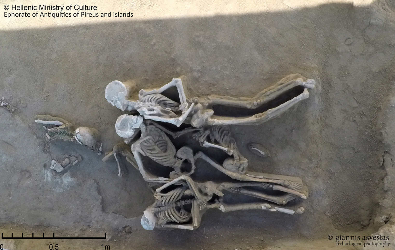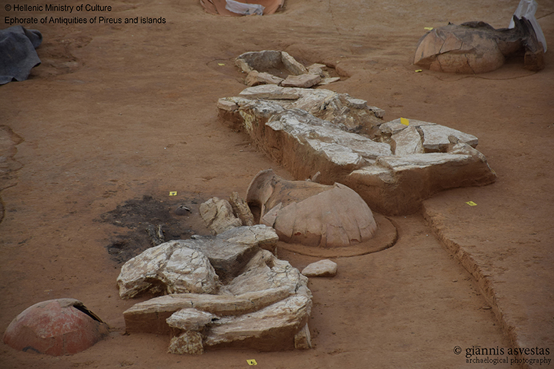 Μεταξύ των ομαδικών ταφών, η πλέον σημαίνουσα είναι αυτή των 79 δεσμωτών που εναποτέθηκαν σε τρεις σχεδόν παράλληλες σειρές στο νοτιοανατολικό τμήμα του νεκροταφείου προς τον αιγιαλό (Εικ.5). Έφεραν σιδηρά δεσμά στους καρπούς, άλλοι δεμένοι πισθάγκωνα και κάποιοι δεμένοι μεταξύ τους[6]. Είχαν όλοι λάβει το θανατηφόρο χτύπημα –της χαριστικής βολής;- στο κεφάλι με όπλο αμβλύ, ίσως ξύλινο ρόπαλο. Η ταφή συμπεριλαμβάνει νέους άνδρες στην πλειονότητα τους 20-35 ετών που παρουσιάζουν άρτια ανάπτυξη, καλή φυσική κατάσταση και εξαιρετική στοματική υγεία. Πρόκειται για τη μοναδική ταφή βιαιοθανάτων σε ολόκληρο το ανεσκαμμένο τμήμα του νεκροταφείου που έχει κτεριστεί, δηλαδή, τους έχουν αποδοθεί νεκρικές τιμές από δύο μικρά αγγεία που θα περιείχαν υγρές προσφορές. Οι δύο αυτές οινοχόες την χρονολογούν στο δεύτερο μισό του 7ου αιώνα. Η χρονολόγηση μας οδηγεί στην περίοδο των έντονων πολιτικών ανακατατάξεων με βίαια επεισόδια μεταξύ των αριστοκρατικών γενών για την κατάληψη της εξουσίας στις οποίες συμμετείχε το πλήθος των φτωχών προσδοκώντας μια καλύτερη μοίρα. Είναι αυτές οι αναταραχές που οδήγησαν στην ανάγκη συγκρότησης των πρώτων αθηναϊκών Νόμων, ώστε να αποφευχθεί η εμφύλια σύρραξη, Νόμοι που σταδιακά η εφαρμογή τους οδήγησε μεταξύ άλλων στη γέννηση του δημοκρατικού πολιτεύματος.